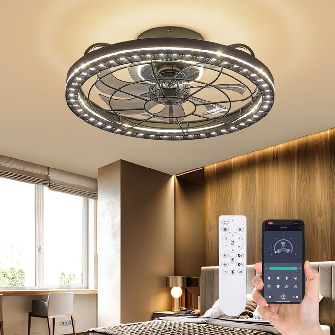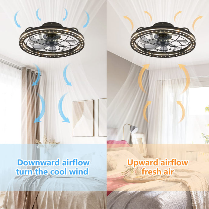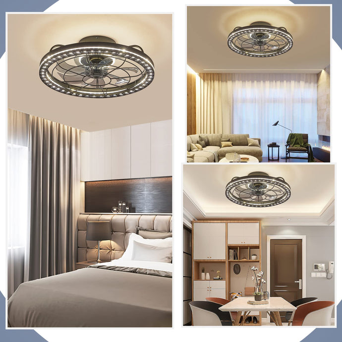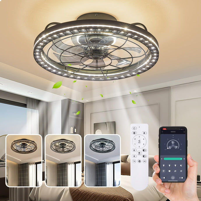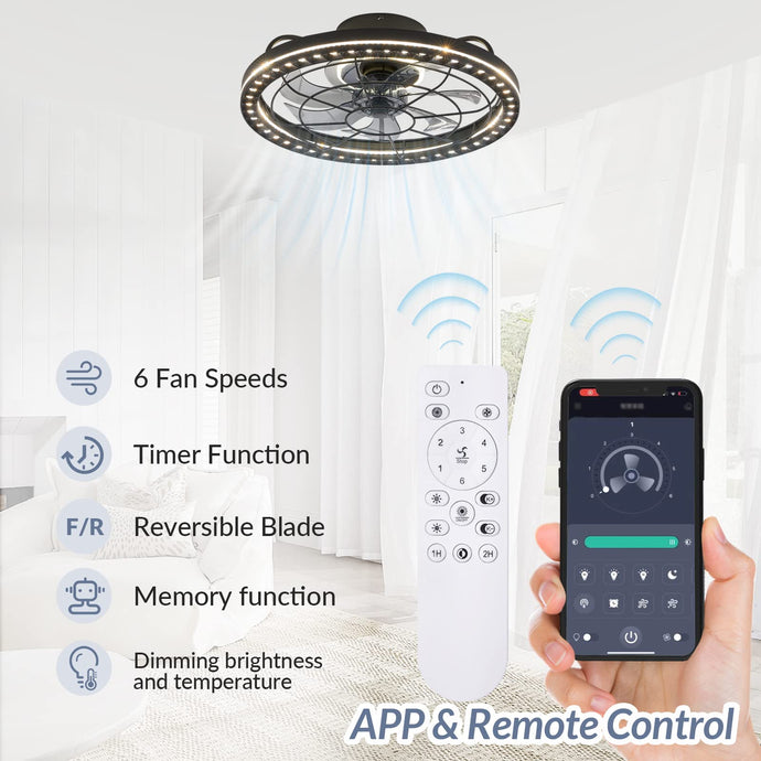 19 Inch Indoor Black Low Profile Caged Ceiling Fan with Dimming Led Lights with Remote Included