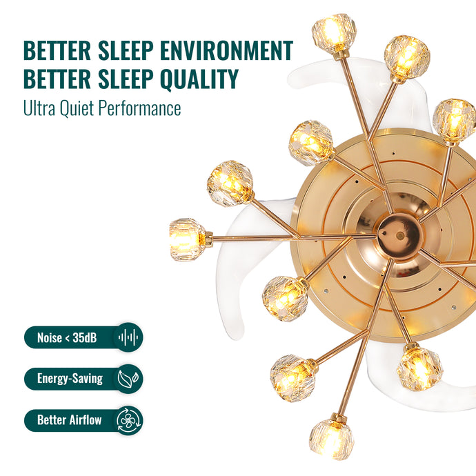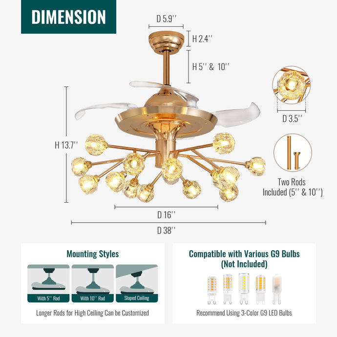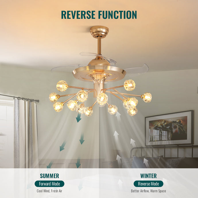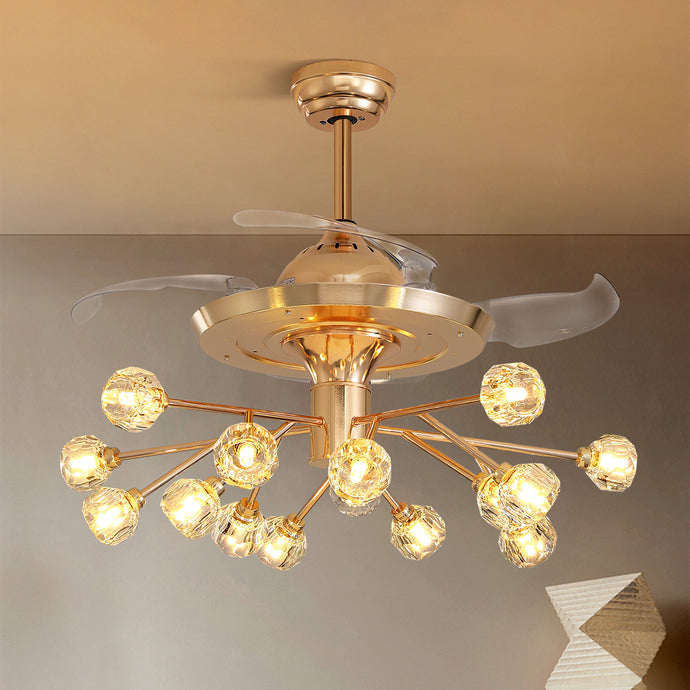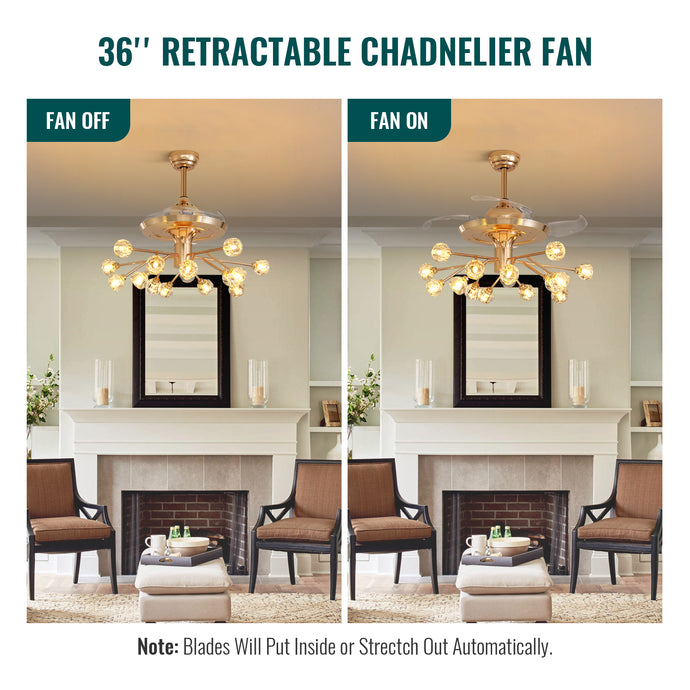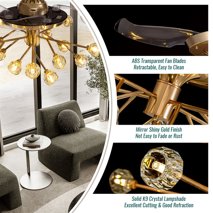 38 in. Gold Crystal Chandelier Retractable Ceiling Fan with Remote Included