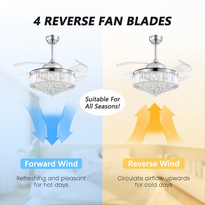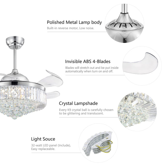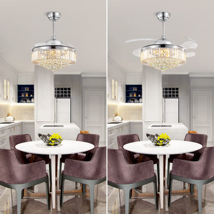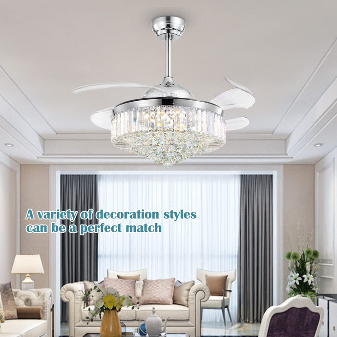 - 【Retractable Crystal Fan】With 4 retractable transparent acrylic ceiling fan blades, in Diameter 42" when extended and 20" when closed. The blades will stretch out and put inside automatically when turning on and off the "fan" button.