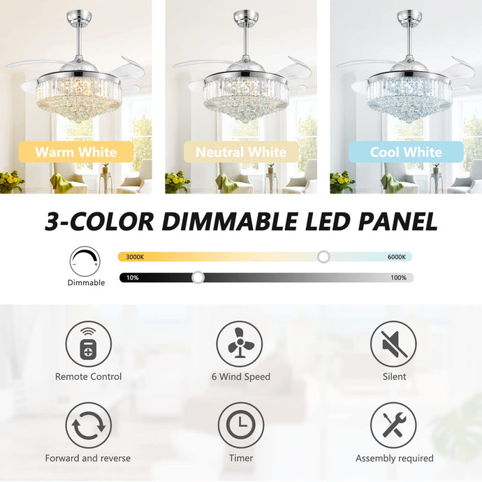 - 【Dimmable Fan Light】Dimming feature ceiling fan with crystals. Lumen brightness dimmed from 800-6120. Color temperature can be changed and adjusted from 2700K (Warm white) to 4500K (Daylight) and end with 6000K (Cool White). Light Souce: 72-watt LED panel, easy to replace.