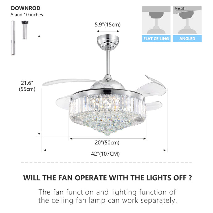 42 Inch Indoor Chrome Smart Retractable Crystal Ceiling Fan with Dimmable LED Light Included with Remote & App Control
