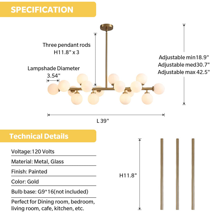 - Dimension: The gold pendant lighting L40”(100CM) x W9.84”(25CM) x H17.71”(45CM).