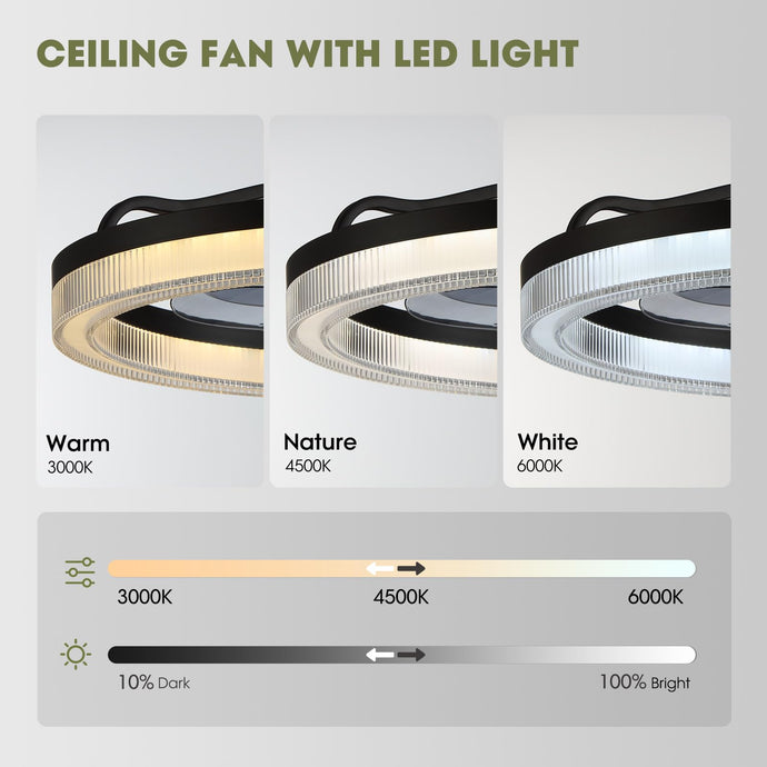 【Dimmable & Memory Mode】The flush mount ceiling fan with lights has a dimming adjustment function, through remote control or APP control, 3-color temperatures ranging from warm light (3000k), natural light(4500K) to white light(6000k), brightness from 10% to 100%. All settings are memorized when turning off lights with remote control, no need to reset them next time.