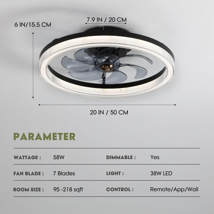 Modern 20 Inch Smart Indoor Black Low Profile Flush Mount Fandelier Ceiling Fan with LED Light with Remote Included