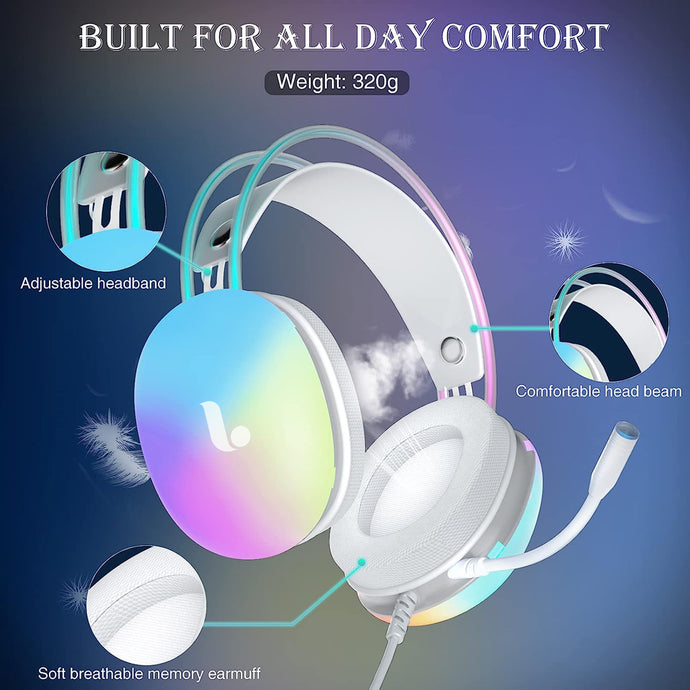- Adaptive Floating Headband and Lightweight Body: The RGB headset features an adaptive floating headband that effortlessly adjusts to your head shape, ensuring a snug and comfortable fit. Combined with its lightweight body, you'll forget you're even wearing headphones.